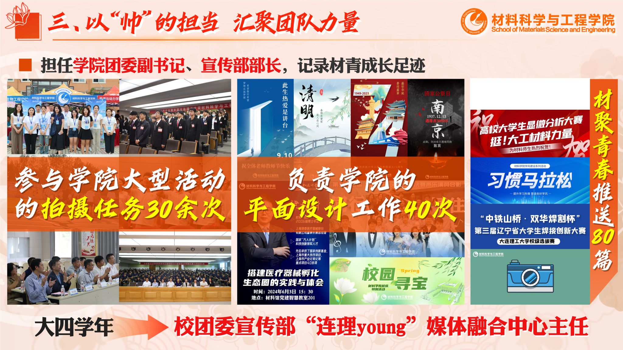 在院团委宣传部,他从一名执行者成长为组织者。累计完成拍摄任务30余次、平面设计40次、推送制作80篇。大四学年他选择继续在校部发光发热,因为这里不仅是施展才华的舞台,更是一份沉甸甸的责任。