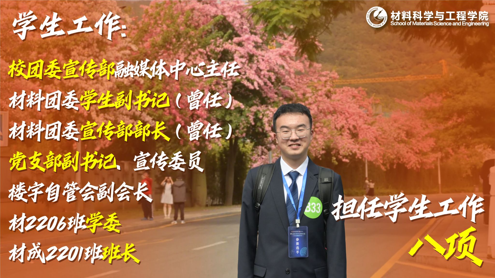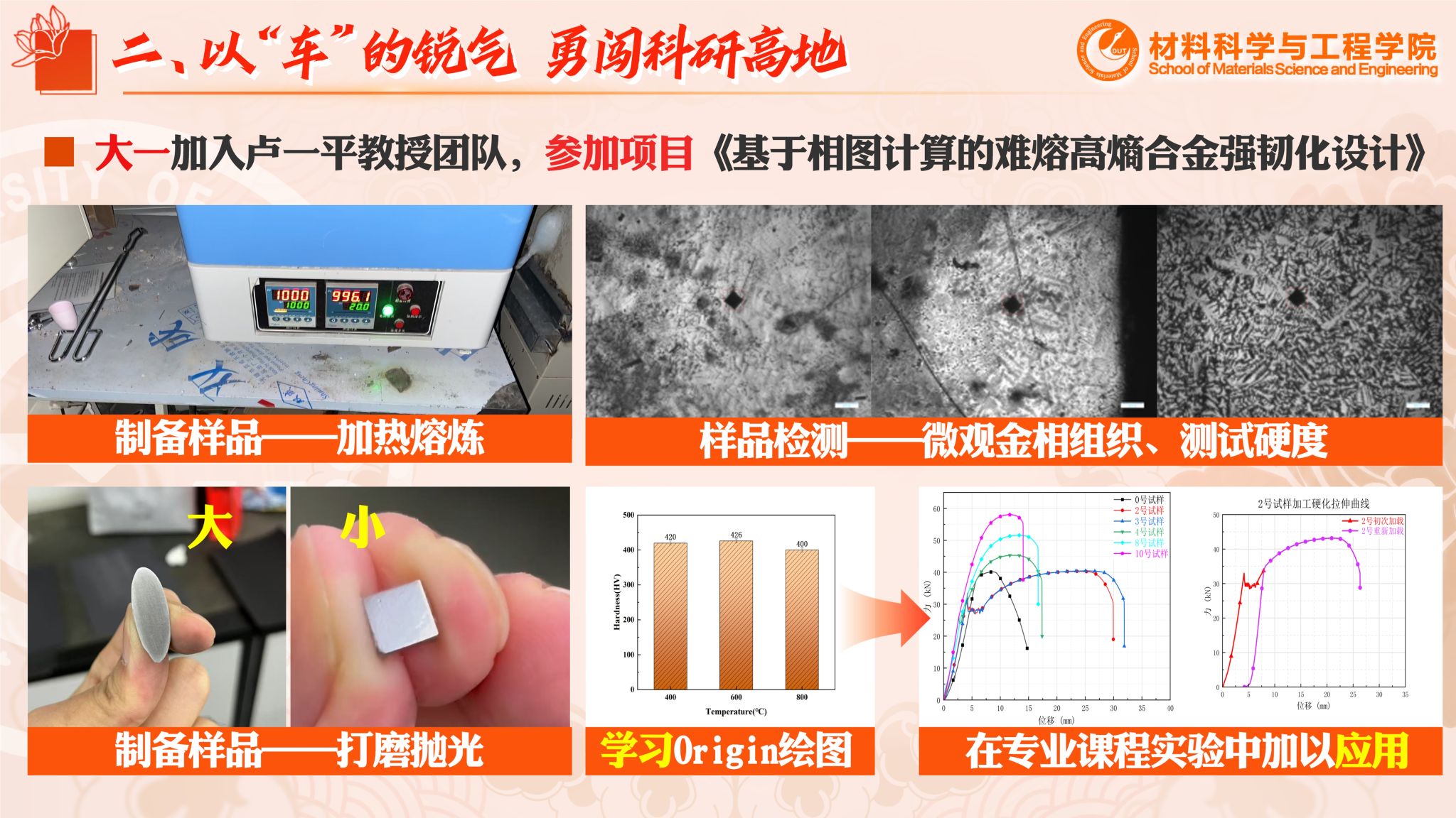 大一起,他便参加卢一平教授大创项目,开展高熵合金的基础研究。记得为制备一个合格样品,屡战屡败。但他深知,科研如棋,必须如“车”般勇往直前、不退半步。于是,他重新设置参数,最终迎来成功的曙光——那一刻他真正明白:科研没有侥幸,唯有死磕到底。