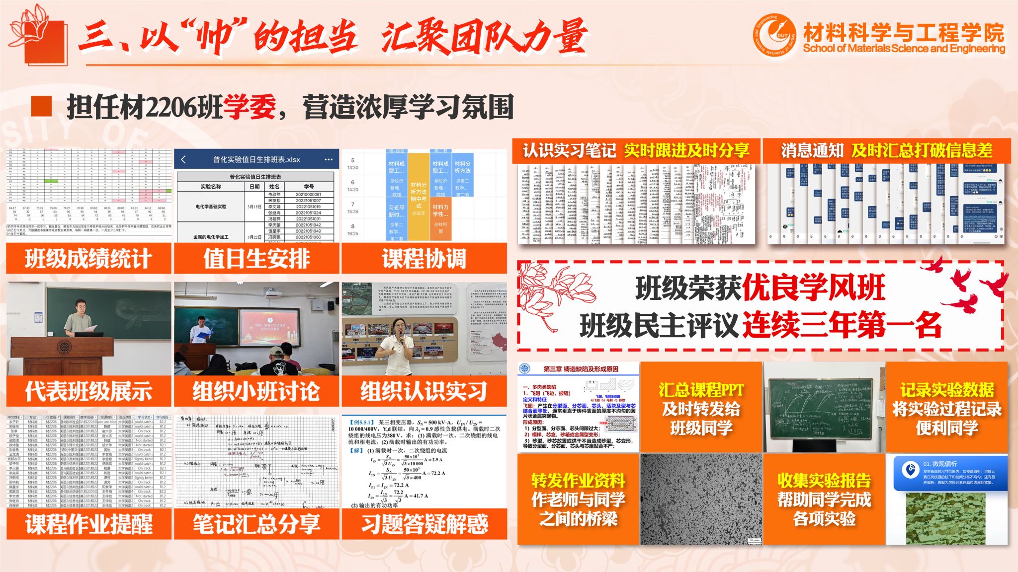 凭着这股劲儿,大三学年,他带领团队参加全国失效分析大赛,从微观金相观察到微区成分分析,运用多种分析手段,精准诊断冷凝器换热管的失效根源,荣获国家一等奖。在全国功能材料创新大赛中,制备热电材料并创新讲解机理,再获国家一等奖。作为队长参加全国三维数字化创新设计大赛,四个月的时间里,方案迭代十余次,实现从0到1的全流程突破,斩获省级特等奖、国家三等奖。