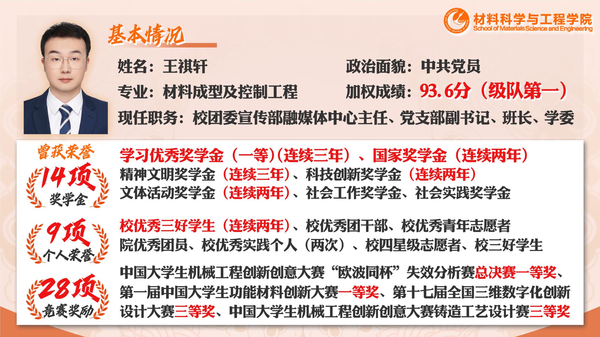 王祺轩,中共党员,材料学院2022级材料成型及控制工程专业。曾任材料学院团委学生副书记兼宣传部部门负责人、材成2201班长、材2206学习委员等职务;获2024-2025学年学习优秀奖学金(一等)和全部5个单项奖学金;获国家奖学金、校优秀三好学生等荣誉称号;获2025年中国大学生机械工程创新创意大赛“欧波同杯”失效分析赛全国一等奖、第一届中国大学生功能材料创新大赛全国一等奖等5项国家级科创奖项。